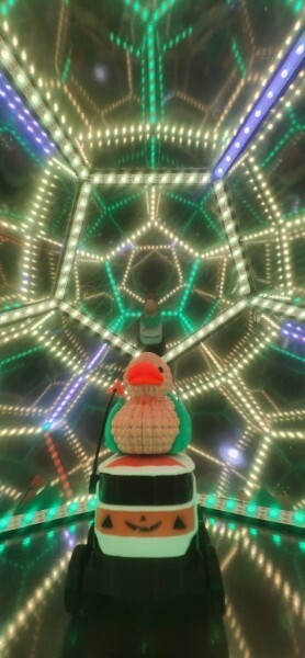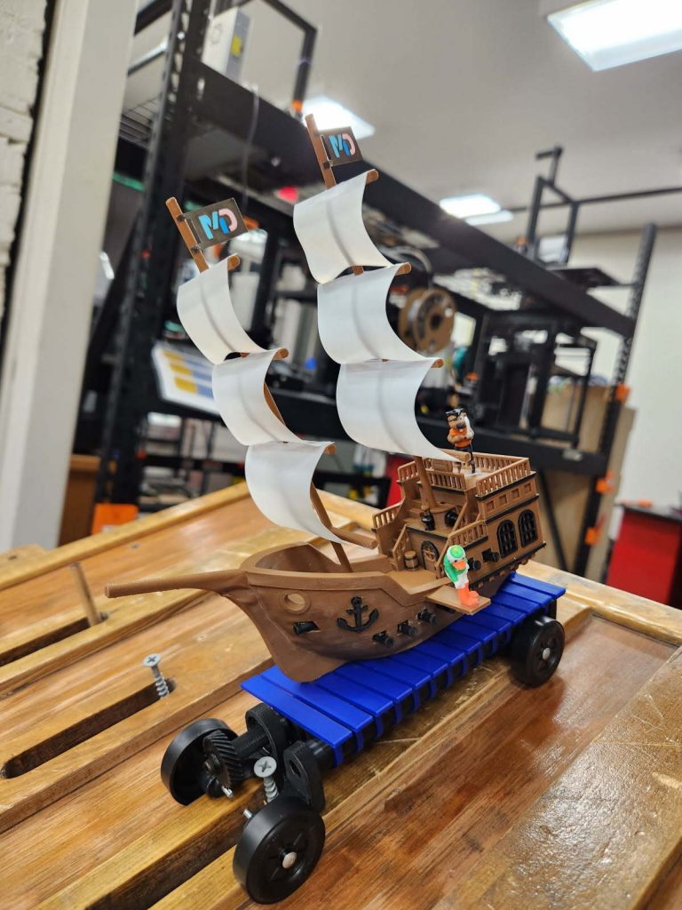 Won 3D Derby 2025 popular vote. Pirate ship derby car with adjustable sails, wave generator powered by rolling, rocking boat on waves, pirate Benny and the Oregon Duck walking the plank. Designed in 2 weeks and fully 3D printed besides minor hardware.