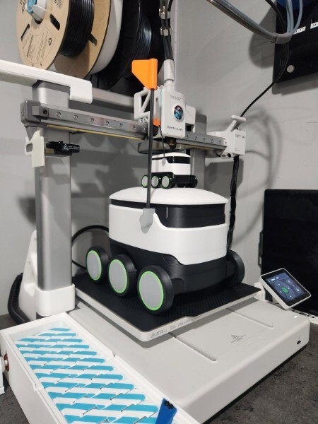 Starship delivery robot model with lid that opens, spinning wheels, and wheel pivot. Additionally inside there’s an Eco2Go container that opens and closes with the classic snap.